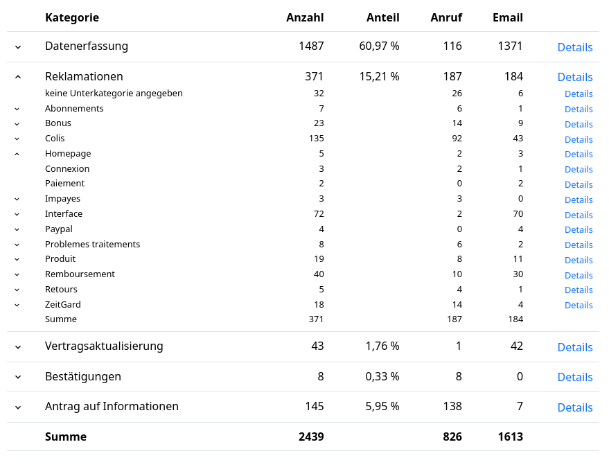 - Drilldown in Unterkategorien und Details
